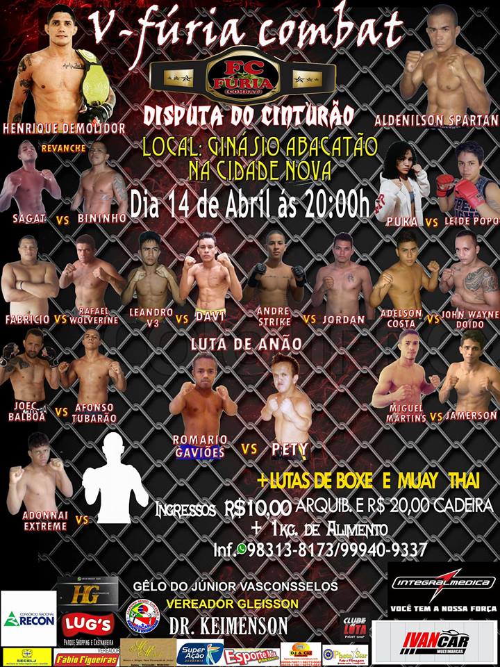 O Fúria Combat irá realizar a sua quinta edição no próximo dia 14 de abril no ginásio Abacatão em Ananindeua(Pa) a partir das 20:00 com destaque para a luta principal que será pela cinturão da categoria 61 Kg entre Henrique Souza “Demolidor” x Aldenilson Spartan .