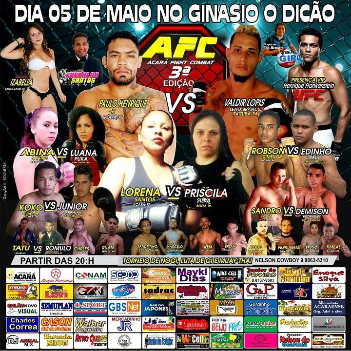 Em sua terceira edição, o evento AFC (Acará Fight Combat) será realizado no ginásio municipal de esportes o “Dicão” , dia 05 de maio a partir das 20h.Contando com lutas de MMA, Jiu Jitsu , K-1 Rules, Muay-Thai e boxe, a terceira edição do AFC terá também um torneio de subimission, as inscrições ainda estão abertas o torneio será no peso até 70kg.